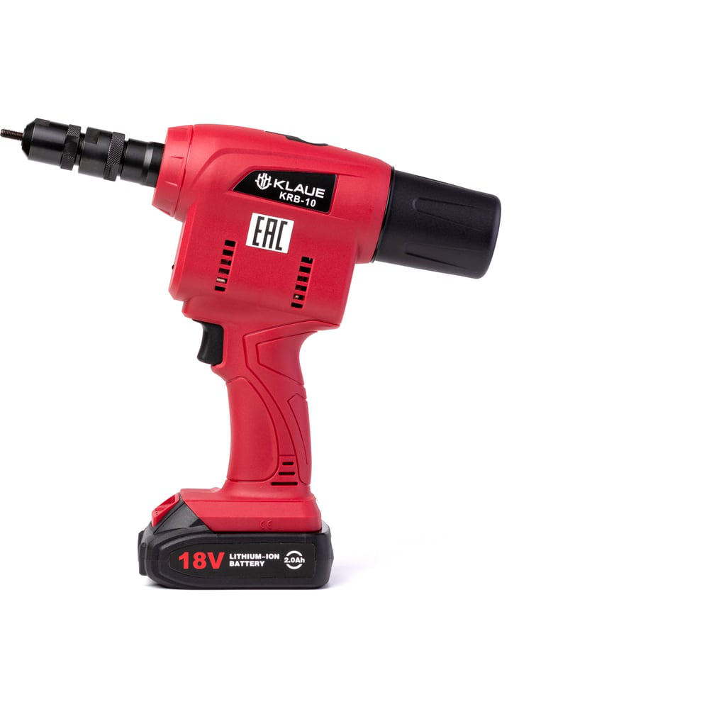 Аккумуляторный заклепочник для установки гаечной заклепки TM KLAUE модель KRB-10. Диаметр заклепок: М4; М5; М6; М8; М10. Материал заклепок: Al, St, A2. Вид заклёпок: цилиндрические, шестигранные, полушестигранные. Двигатель: 18v постоянного тока Рабочий ход: 1-6 мм. Сила вытягивания: 16000 Н. Масса без аккумулятора: 1,75 кг. Масса с аккумулятором: 2,0 А/ч: 2,15 кг. Аккумулятор Li-ion 18,0 вольт с индикатором заряда/разряда. Время полной зарядки аккумулятора: не более 60 минут. Резьбовой элемент: шпилька класс прочности 12.9; Встроенная защита от перегрузок и подсветка рабочей зоны инструмента. Навинчивание заклёпки нажатием на спусковую кнопку.