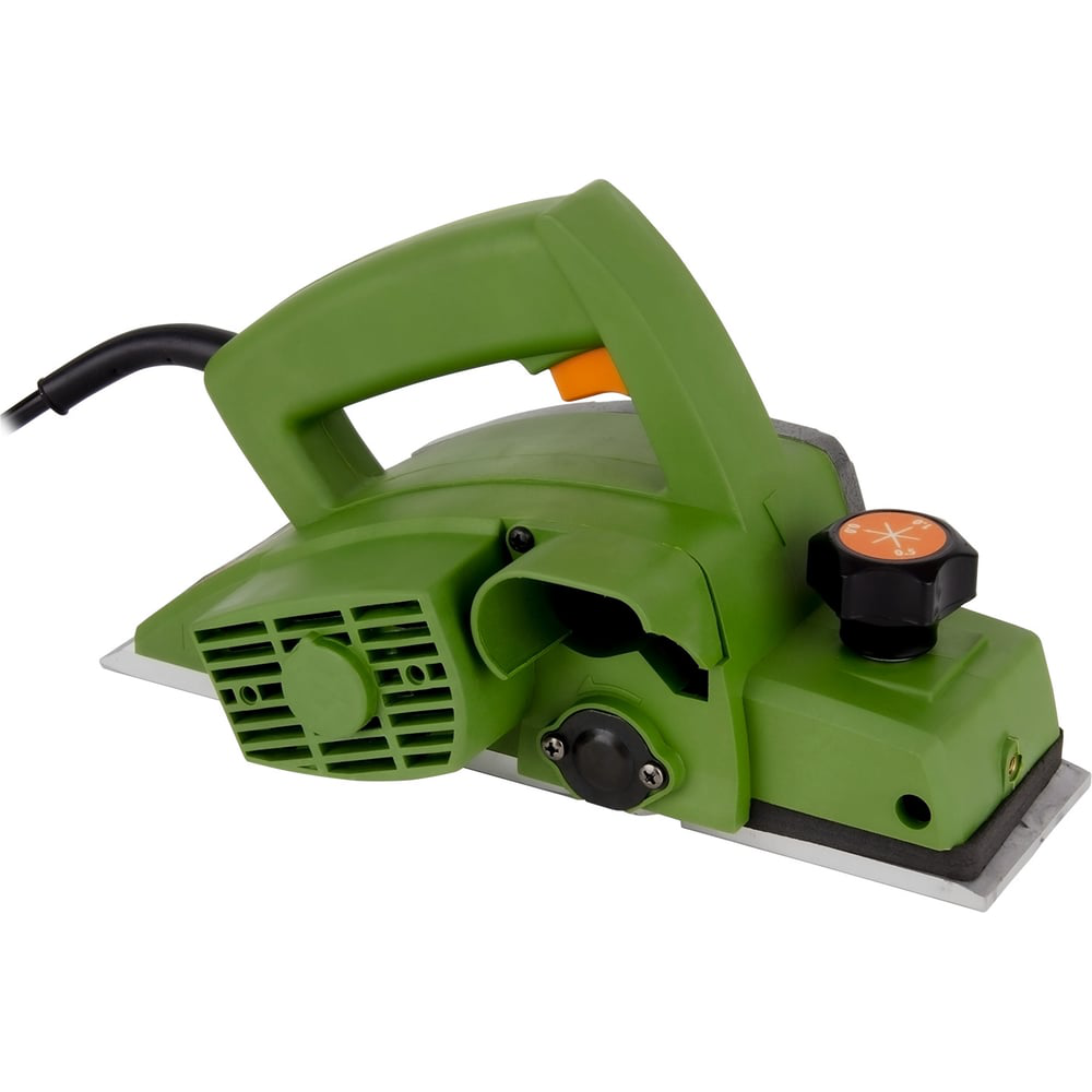 Электрический рубанок – устройство для обработки материалов из дерева разных пород. Оборудование предназначено для строгания плоских поверхностей. Обладает микрорельефной рабочей поверхности, за счет чего предотвращается вероятность образования подушки. Рубанок отлично прилегает к обрабатываемой поверхности. В работе обеспечивается направленный выброс стружки. Глубина строгания регулируется пользователем. Электрорубанок имеет двигатель мощностью 1150 Вт (15000 об/мин), обеспечивает глубину строгания от 0 до 2 мм за один проход (шаг 0.1 мм). Данная модель имеет эргономичный дизайн.