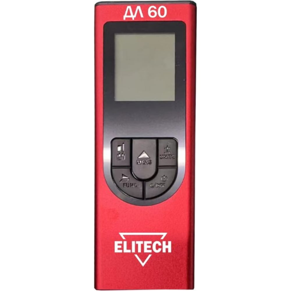 ELITECH — российский бренд, занимающийся разработкой, продажей и обслуживанием электроинструментов. Компания полного цикла, каждый наш инструмент мы ведём на всех стадиях от электронного чертежа, сертификации, контроля качества на производстве — до гарантийного обслуживания в собственных сервисных центрах.Инструменты ELITECH серии «ДОМАШНИЙ МАCТЕР» помогут своему владельцу решить все бытовые задачи по хозяйству. Их качество, надёжность, долговечность обеспечат ваши потребности на годы вперёд. При этом они не нагружены лишним для вас функционалом. Это делает инструменты привлекательными по цене. Платите только за то, что вам реально необходимо.Дальномер ELITECH ДМ ДЛ 60 предназначен для быстрого измерения расстояний на дальности до 60 метров. Он точнее обычной рулетки при измерении расстояния более 8 метров. Дальномер имеет возможность производить косвенные вычисления (измерять высоту объекта) по теореме Пифагора, а также замеры площади и объема. В качестве начала измерения используется 2 точки отсчета – от передней кромки и от заднего края. Дисплей прибора имеет подсветку, что повышает удобство работы с прибором в условиях недостаточной освещенности. Прибор позволяет сохранить в памяти 20 значения измерений.