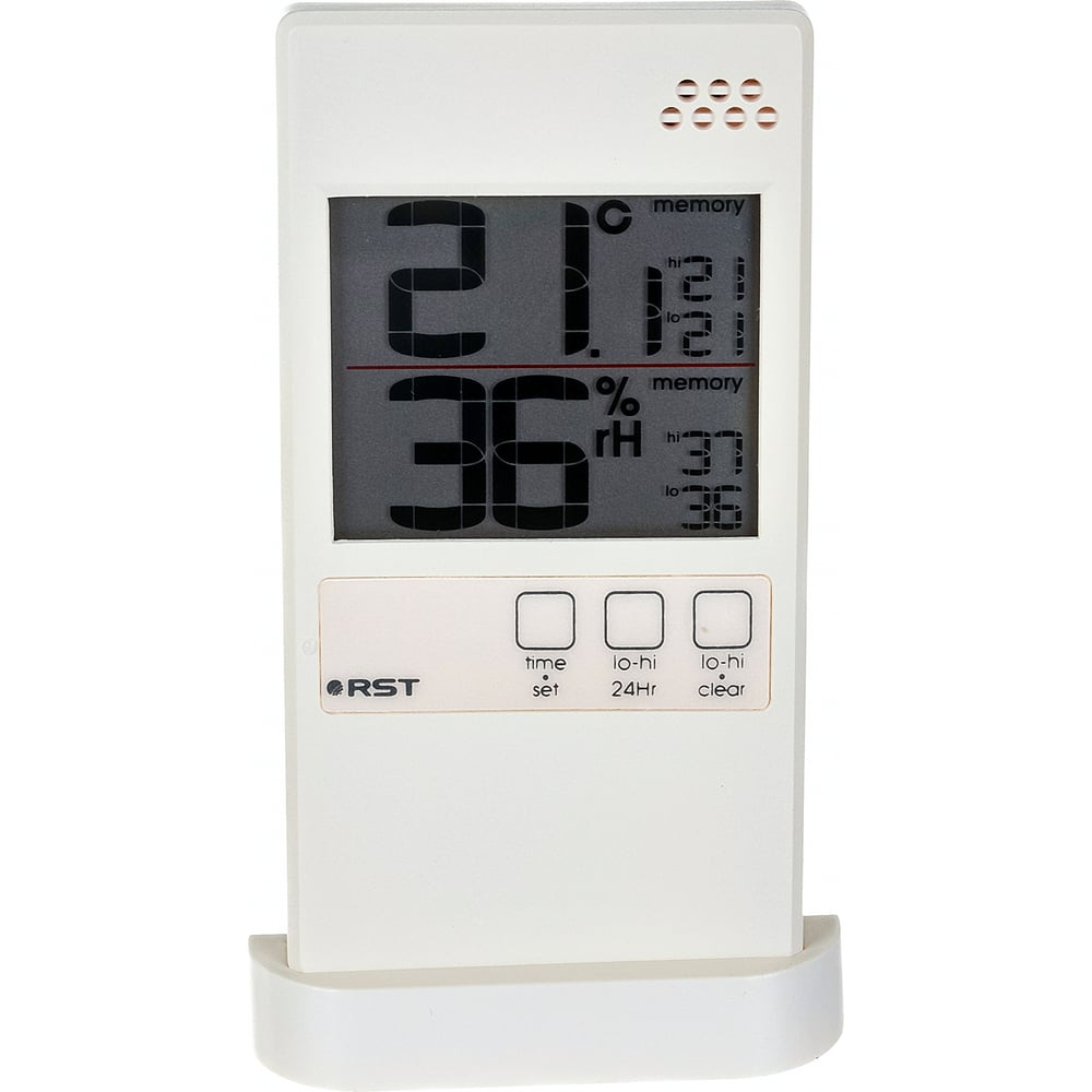 Цифровой термогигрометр RST, слоновая кость RST01593 рредставляет собой ультратонкий электронный термометр-гигрометр, который крепится на оконной раме или другой поверхности при помощи двустороннего скотча. Прибор может быть установлен на входящей в комплект подставке. Определяет температуру и относительную влажность воздуха в помещении, фиксирует максимальные и минимальные значения за текущие сутки, отображает тенденцию изменения. Сохраняет в памяти максимальные и минимальные значения за весь период с возможностью сброса показаний.