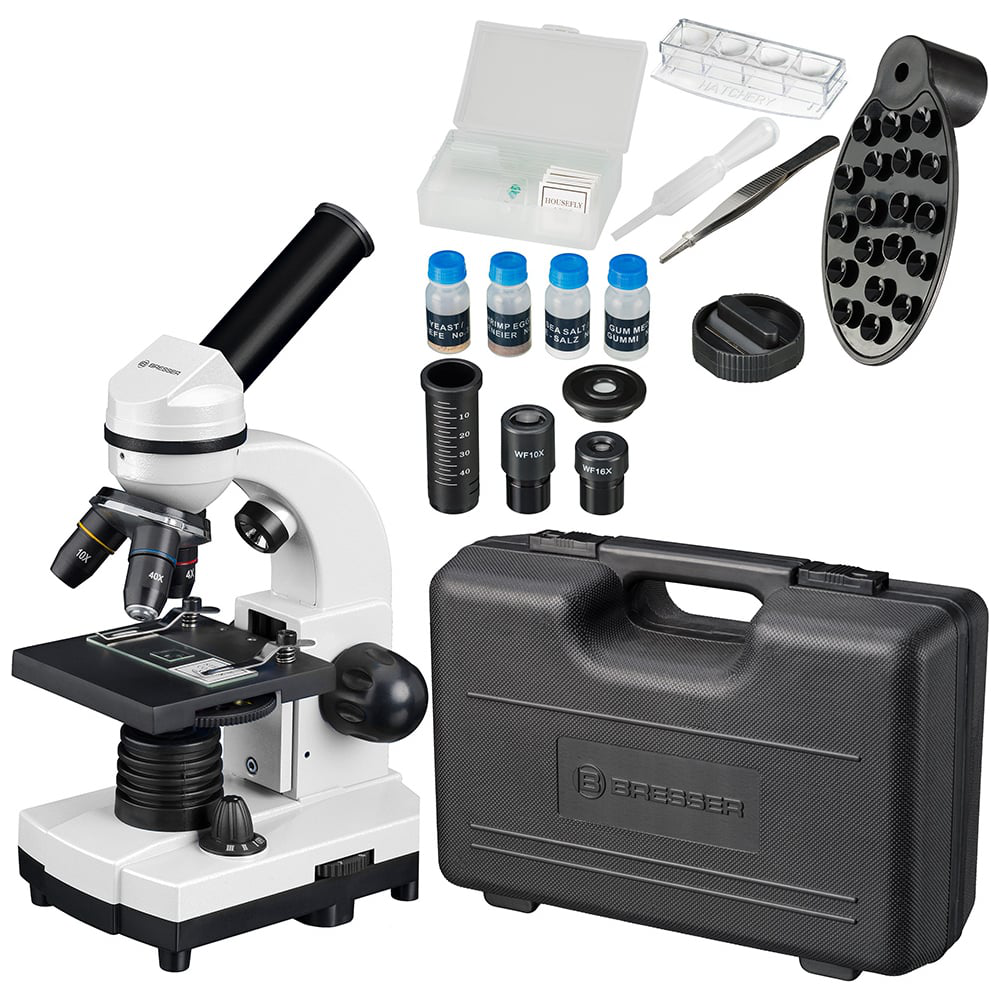 Микроскоп Bresser Junior Biolux SEL 40–1600x, белый, в кейсе 75314 – оптический прибор для работы с биологическими образцами любой степени прозрачности. Благодаря комбинированной подсветке он позволяет изучать и непрозрачные, и полупрозрачные, и полностью прозрачные препараты. Помимо оптических возможностей, стоит отметить комплектацию микроскопа. Здесь есть большой набор для опытов, жесткий кейс для транспортировки и хранения, а также адаптер для смартфона. В микроскопе установлено трехгнездное револьверное устройство, в котором уже находятся объективы 4х, 10х и 40х. Монокулярная насадка наклонена под небольшим углом, поэтому длительные наблюдения не вызывают сильной усталости. Окуляров два, разной кратности, они обеспечивают хорошее поле зрения. Кроме того, увеличение оптики можно усиливать в два раза при помощи комплектной линзы Барлоу. Общее увеличение микроскопа составляет от 40 до 1600 крат, что подходит для большинства любительских микронаблюдений. Предметный столик снабжен зажимами для микропрепаратов. Для освещения образцов используется верхняя и нижняя подсветка. Светодиоды можно включать вместе или по отдельности. Яркость подсветки регулируется. Можно дополнительно настроить освещение при помощи встроенного диска с диафрагмами.