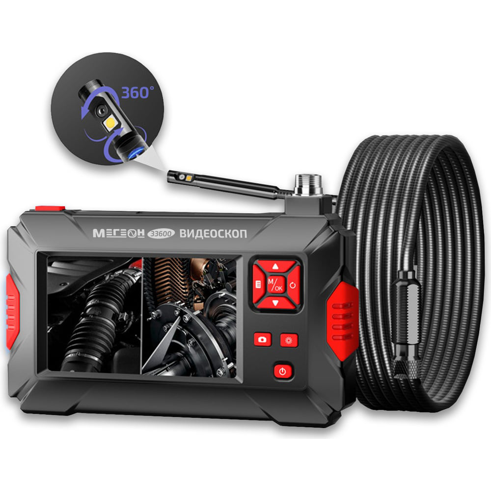 МЕГЕОН 33600 – это цифровой видеоскоп с полужёстким зондом длиной 5 метров и поворотным блоком камер, управляемым с панели. Данная модель оборудована двумя видеокамерами высокого разрешения с регулируемой яркостью светодиодной подсветки для работы в темном пространстве. Наличие встроенного аккумулятора позволяет использовать прибор автономно, с цветным жидкокристаллическим дисплеем диагональю 4,3 дюйма. Оснащён функцией сохранения фотографий и записи видео в режиме реального времени на карту памяти microSD. Он предназначен для проведения визуального обследования в труднодоступных местах, таких как: трубопроводы, коллекторы, вентиляционные шахты, скрытые полости механизмов и другие, где осмотр сильно затруднён. Устройство станет вашим незаменимым помощником в автосервисе, в строительстве, эксплуатации зданий и сооружений и других сферах. Благодаря компактной камере с обзором на 360 он идеально подходит для эндоскопии поршневой ДВС.