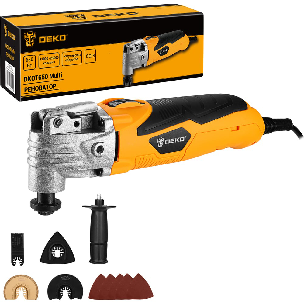 Реноватор быстрозажимной DEKO DKOT650 Multiпредназначен для пиления, резки, шабрения и шлифования в труднодоступных местах, таких как углы и кромки. Технические характеристики: Напряжение: 230 В/50 Гц Мощность: 650 Вт Частота колебаний: 11000-23000 кол/мин Угол колебаний: 3,2° Тип соединения: OQIS Регулировка оборотов: да Плавный пуск: нет