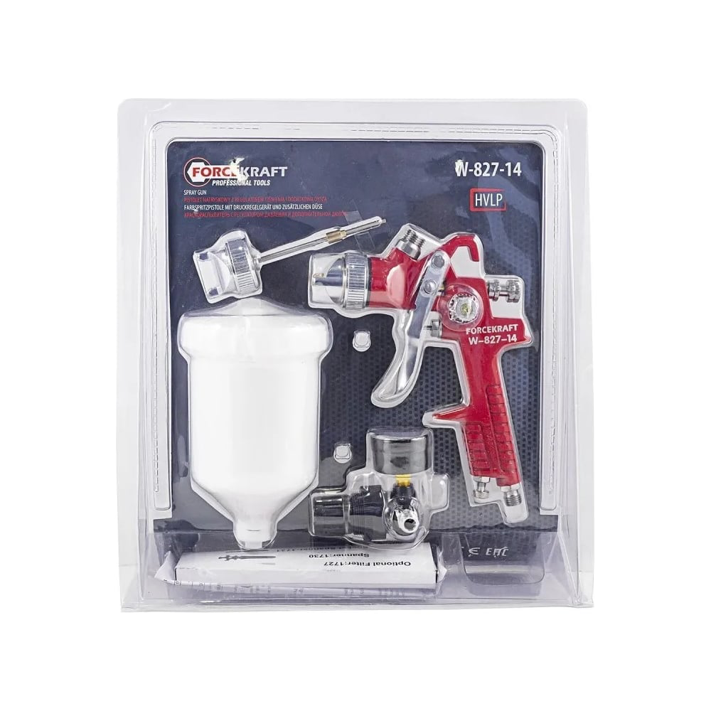 Краскораспылитель с регулятором давления и дополнительной дюзой Forcekraft FK-W-827-14 51348 – очень удобный инструмент для равномерного и быстрого окрашивания различных поверхностей, поэтому его часто используют в ремонтных работах. Он дает наилучший результат по гладкости покрытия. Технология распыления HVLP – отличается высоким объемом распыления при низком входном давлении. К особенностям относится больший уровень переноса материала.