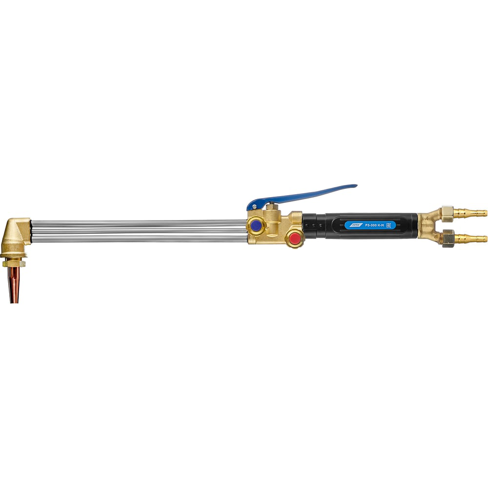Универсальный резак Р3-300 К-М внутрисоплового смешения газов предназначен для ручной кислородной резки листового и сортового металлопроката из низкоуглеродистых сталей толщиной до 300 мм. Резак обладает повышенной надежностью конструкции, которая достигается за счет штампованных латунных элементов резака. На резаке установлена ручка из высокотемпературного штампованного пластика, выдерживающая температуру до 200°С, благодаря чему можно работать в тонких рукавицах. Резак может работать на пропане и ацетилене. Выбор газа зависит от установленных газосмесительных мундштуков. Мундштуки имеют три запорных пояска, которые предотвращают перетечку газов и обеспечивают смешение газов непосредственно в мундштуке, обеспечивая безопасное использование. Резак поставляется c разборным пропановым мундштуком №2PM. Давление газа на входе и расход зависит от установленного мундштука.