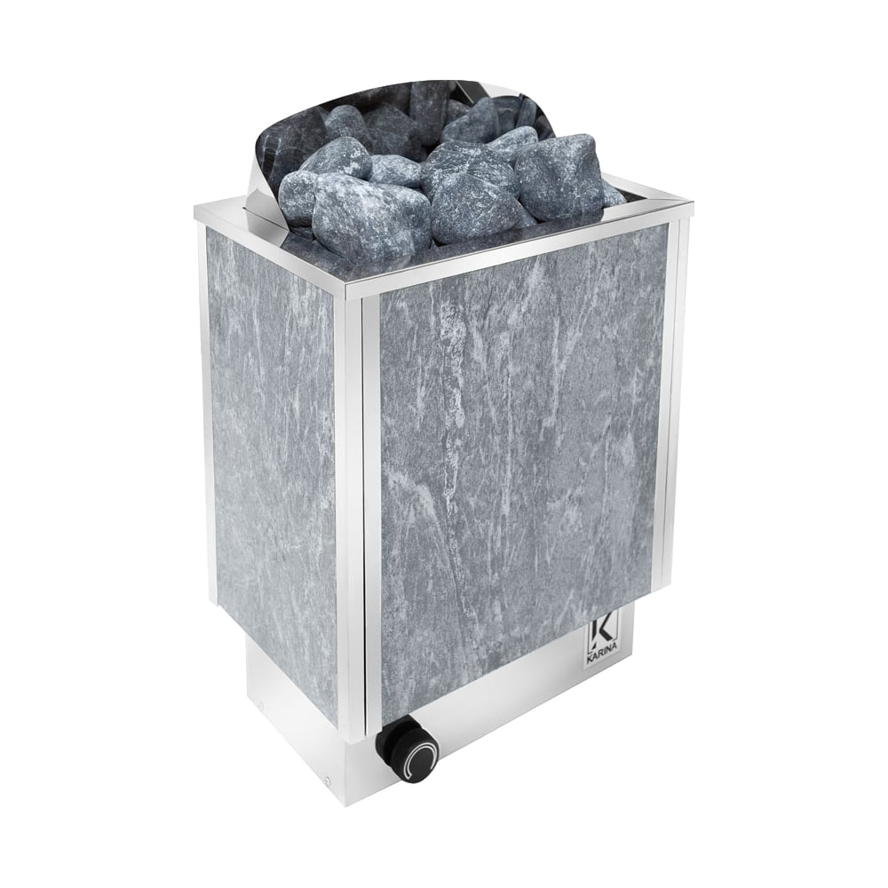 Электрическая печь Karina Trend 9 Талькохлорит Tr-9-220/380-T подходит для обогрева домашних бань и саун объемом от 12 до 14 куб.м. Для удобной эксплуатации в комплект поставки входит встроенный пульт управления. С помощью него пользователь легко может регулировать температуру нагрева воздуха. Облицовка из талькохлорита придает устройству стильный и современный вид.