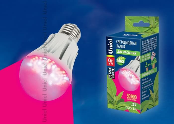 Светодиодная лампа для растений Uniel LED-A60-9W/SP/E27/CL ALM01WHСветодиодная энергосберегающая лампа для растений с цоколем Е27 — это светодиодная лампа, имеющая специальный спектр излучения с преобладанием синего и красного цветов. Благодаря такому излучению активизируются процессы фотосинтеза и заметно ускоряется рост и развитие растений. Светодиодные лампы для растений рекомендуются для дополнительного освещения (подсветки) комнатных растений и рассады.