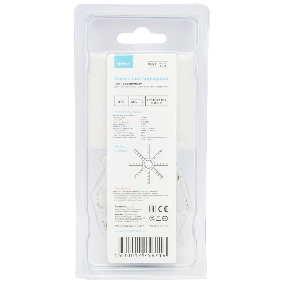 Расширенная гарантия на товар составляет 12 месяцев. поставщик рекомендует использовать лампы накаливания с цоколем не указан для освещения площади не указана м2. Светодиодный модуль Apeyron Звездочка 12-15 в современном стиле используется в интерьере не указан с установкой не указано.