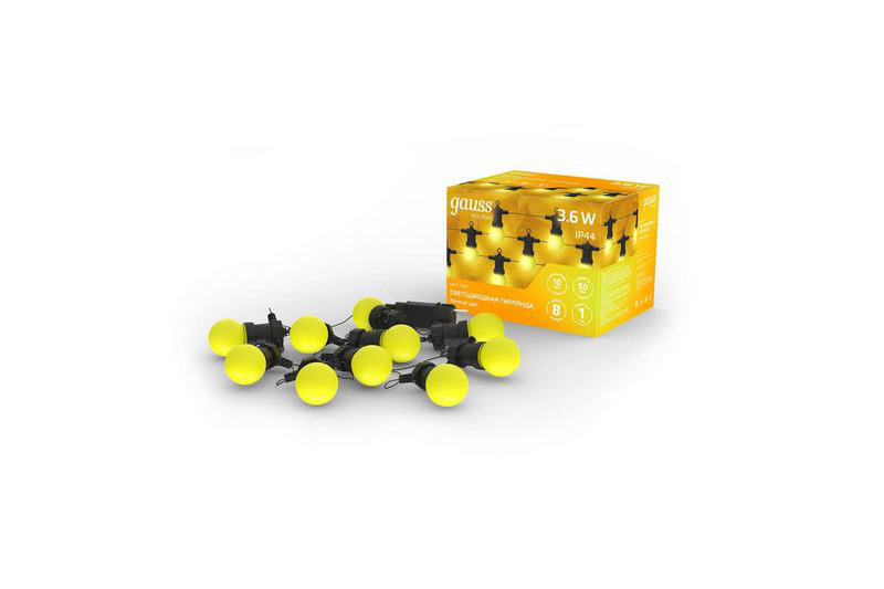 Гирлянда состоит из 10 несменных светодиодных ламп яркого желтого цвета. Эти лампы обладают высокой эффективностью и долгим сроком службы, что гарантирует надёжную работу гирлянды на протяжении длительного времени. Каждая лампа декорирована специальным защитным кожухом IP44, который обеспечивает защиту от пыли и брызг воды, делая гирлянду подходящей для использования как внутри помещений, так и на открытом воздухе.