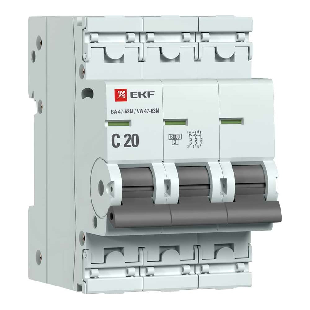 Автоматический выключатель EKF 3P 20А (C) 6кА ВА 47-63N PROxima M636320C - это компактный прибор, позволяющий осуществлять ручное отключение и включение управляемых им участков цепи и обеспечивающий защиту элетросети от короткого замыкания и перегрузки. Устанавливается в настенном щите или напольном шкафу на DIN-рейку. Конструкция модели автоматического выключателя дает возможность подключать дополнительные контролирующие, управляющие и обслуживающие устройства.