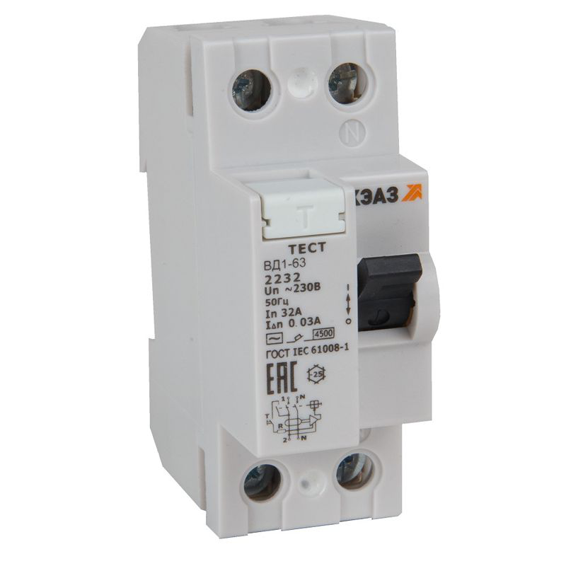 Двухполюсное устройство защитного отключения на номинальный ток 63 А, номинальный отключающий дифференциальный ток 30 мА и рабочее напряжение переменного тока 230 В.